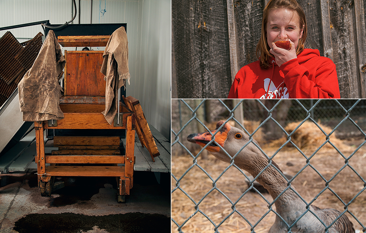 Clockwise from Left: The Dressels’ 35-year-old wood cider press. Sarah enjoying a Cortland. The farm’s welcoming committee.
